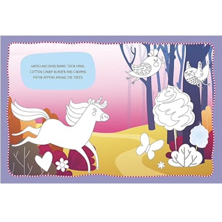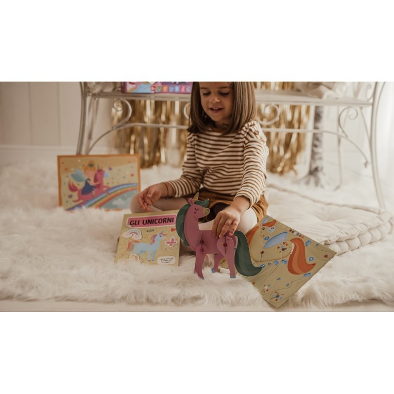 The mega box contains a 32-page activity book, 3 unicorn models to assemble, 2 scenarios to complete, 20 stickers, 4 sheets of mini origami to build, 4 scratching sheets with a wooden stick, and 2 scenarios to complete with iridescent sheets, glitter, and colored tiles