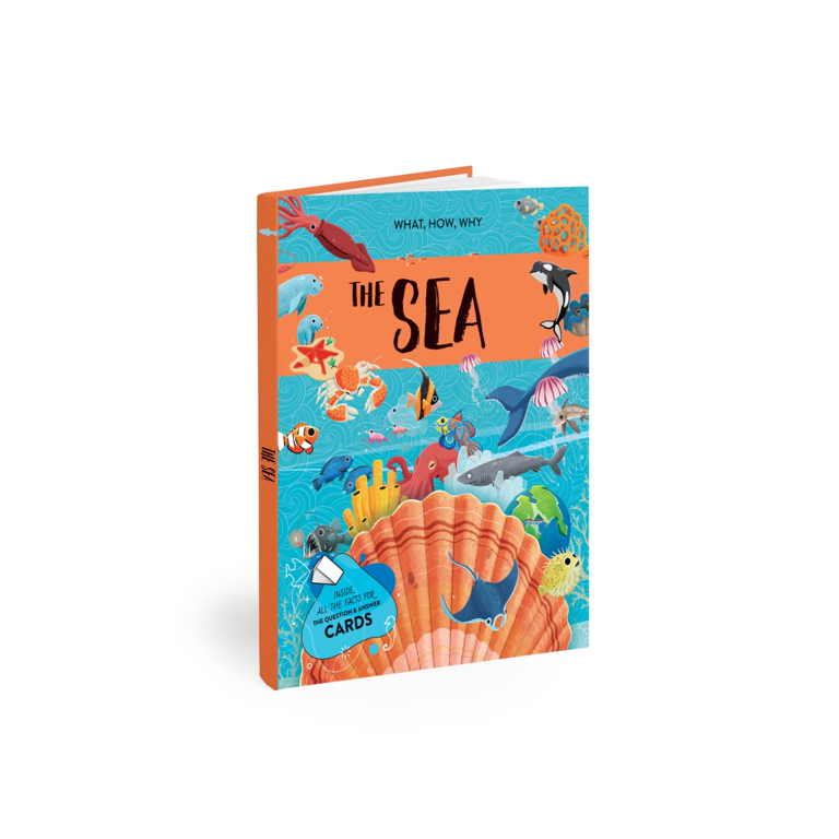 A box with iridescent details containing 40 question-and-answer cards about the sea, a 500-piece puzzle, 20 shaped figures of marine creatures and phenomena to place on the puzzle, and a 64-page atlas rich in interesting facts about the sea.
