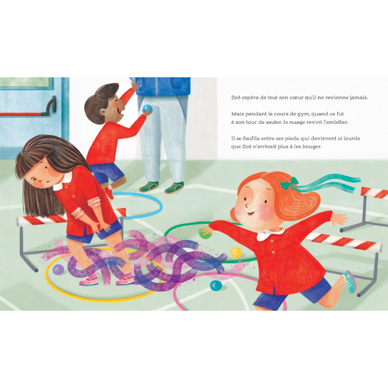 La première fois que Zoé vit le nuage violet, elle attendait sa maman à la sortie de l’école. Mais sa maman était en retard, et plus le temps passait, plus Zoé s’inquiétait. L’enchevêtrement de pensées sombres qui occupait son esprit grandit jusqu’à former un nuage. Non pas un nuage blanc et léger, mais un nuage violet, lourd et traversé de petits éclairs tonitruants, qui bloquait ses pieds et brouillait sa vue... Un livre qui aborde avec tact et sensibilité le sujet de l’anxiété chez les jeunes enfants, et propose comme solution l’amitié, le soutien et la compréhension.
