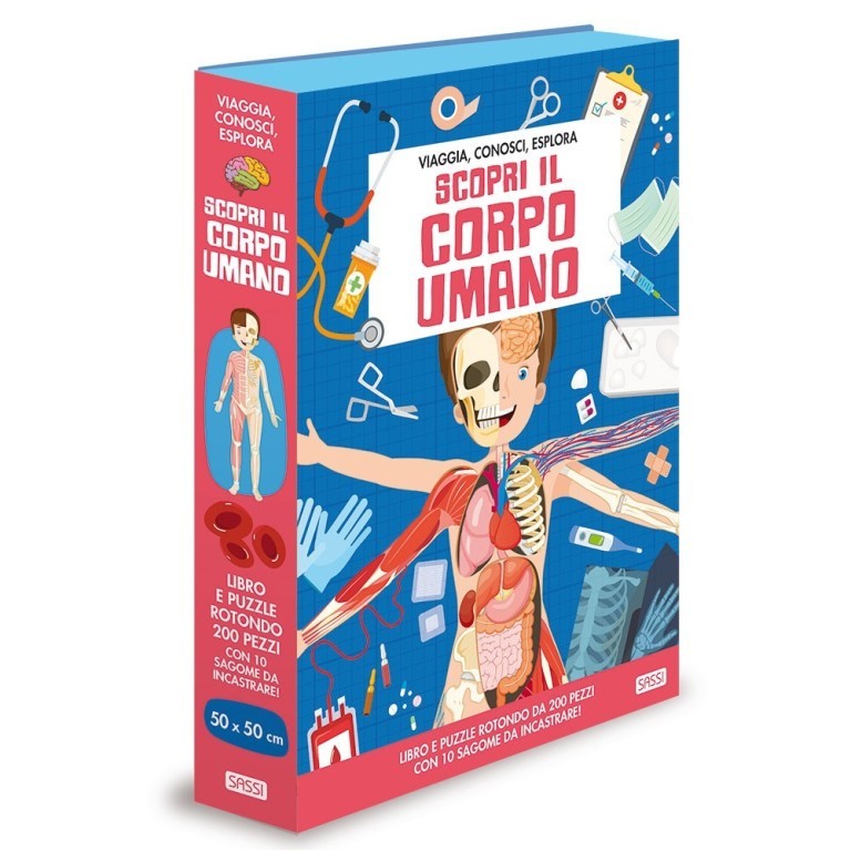 An innovative round puzzle on the human body with 10 moulds to be placed vertically, illustrating the main tools used in the medical field.