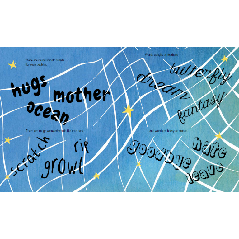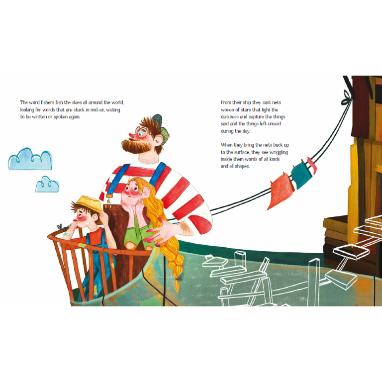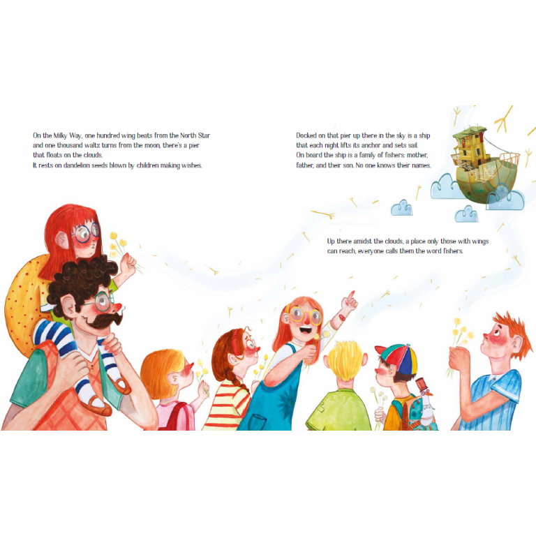 There's a ship that sails the skies every night all over the world to gather words that have remained suspended in mid-air. A family of fishermen is on board. No one knows their names. Beyond the clouds, where only those with wings can reach, everyone calls them the word fishermen. With nets woven from stars, they collect words of every kind and size, but there's one, large and brilliant, that they just can't grasp, yet it's so beautiful and luminous that they cannot give up.