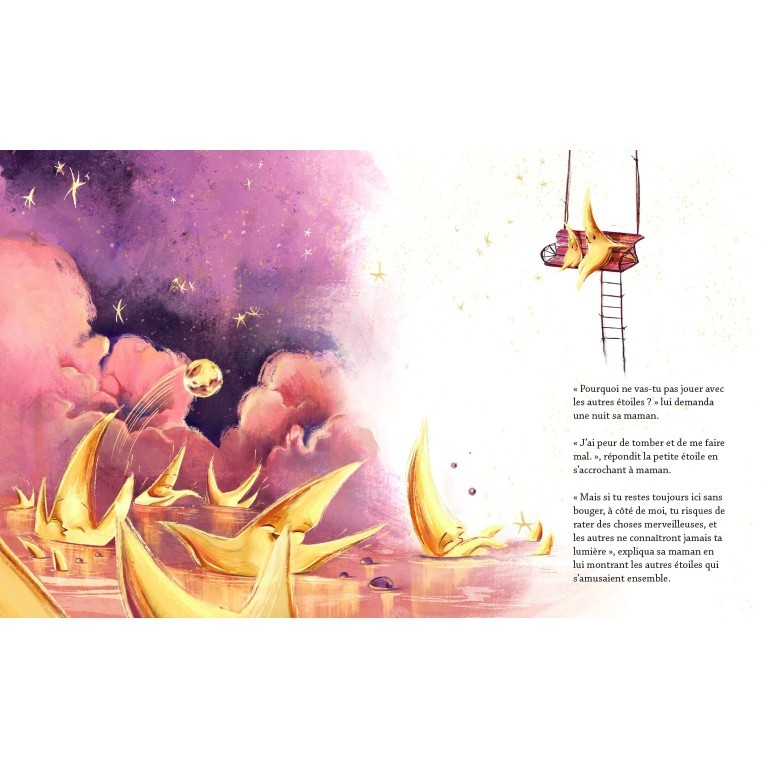 Dans un coin du ciel, au milieu de la Voie lactée, brillait une petite étoile. Chaque nuit, elle se réveillait, puis commençait à émettre sa lumière. Mais peu arrivaient à la voir, car la petite étoile ne quittait jamais son coin, à côté de sa maman. Autour d’elle, les autres étoiles dansaient avec les lucioles, couraient après les papillons de nuit, faisaient des chatouilles à la lune, indiquaient le chemin aux voyageurs égarés et filaient vers le sol quand quelqu’un voulait faire un voeu. Mais pas la petite étoile, qui restait fermement à sa place.