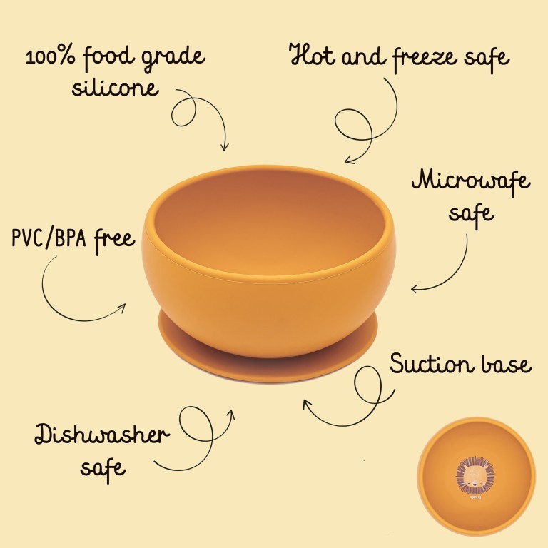 Chompy the lion's silicone bowl for babies is perfect for their first grown-up meals. The high walls of the bowl make it easier for the baby to eat independently while a suction base ensures their safety. The bowl is made from food-grade silicone, it's dishwasher safe, and microwave safe. Accompanied by Chompy the brave lion, weaning will be fun for little children!