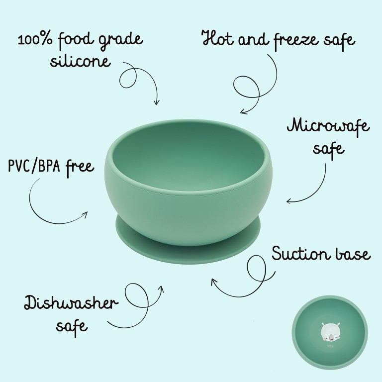 Munchy the bear's silicone bowl for babies is perfect for their first grown-up meals. The high walls of the bowl make it easier for the baby to eat independently while a suction base ensures their safety. The bowl is made from food-grade silicone, it's dishwasher safe, and microwave safe. Accompanied by Munchy the sweet bear, weaning will be fun for little children!