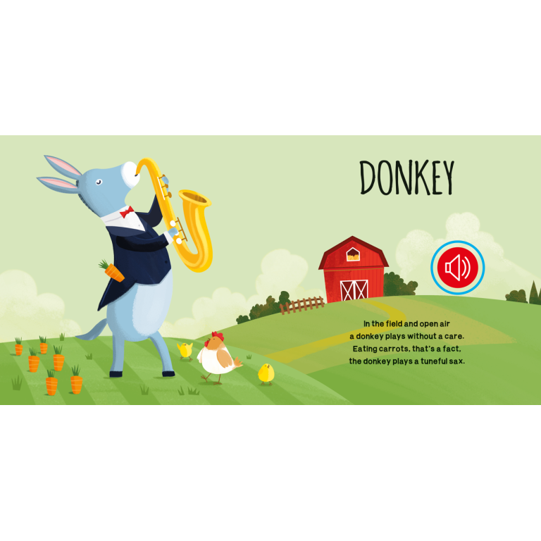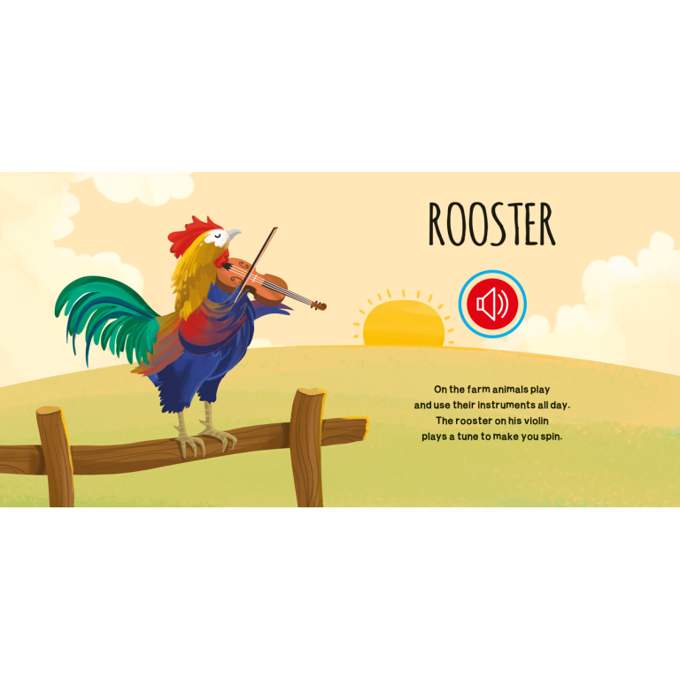 Here are the little farm animals. Read their adventures, press the buttons, and learn to recognize their calls. Pull and push the handle: a sweet melody will accompany your reading