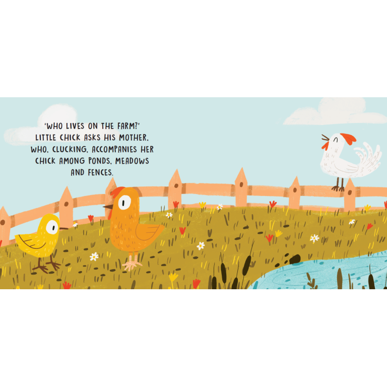 Do you know the animals that live on the farm? Follow the chick who, accompanied by mother hen, meets horses, cows and sheep. Browse the pages and listen to their verses!