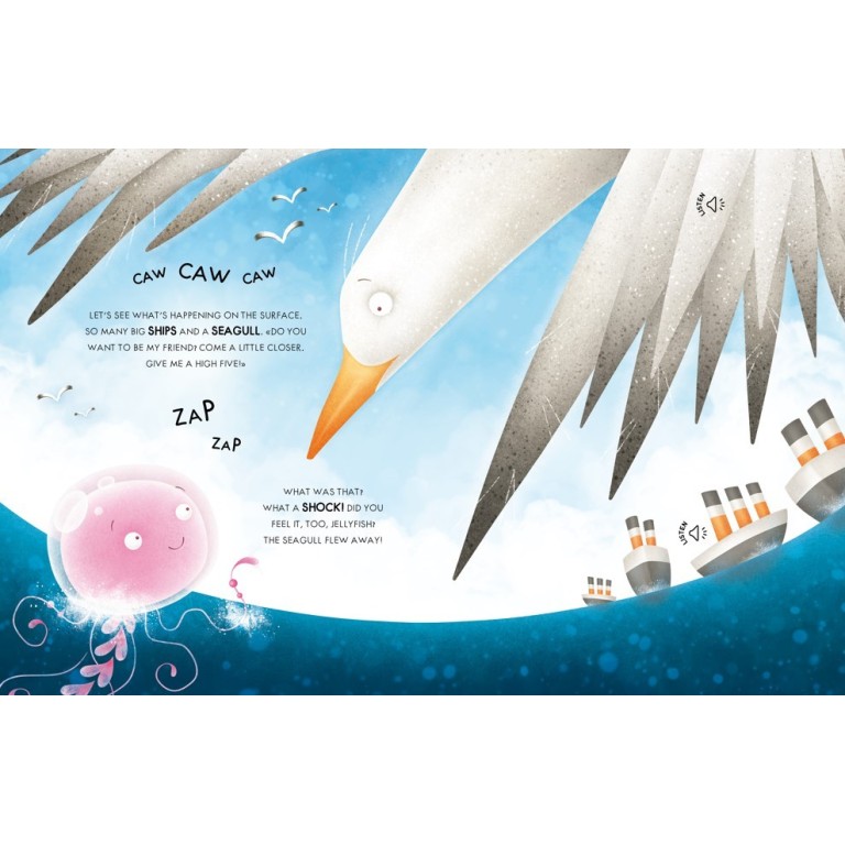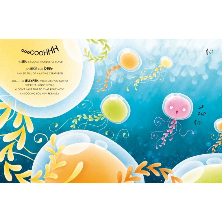 A tiny jellyfish is bobbing around in the big blue sea and being thrown around by the waves. Follow her charming adventure as she travels through the sea surrounded by coral and lots of different sea creatures.