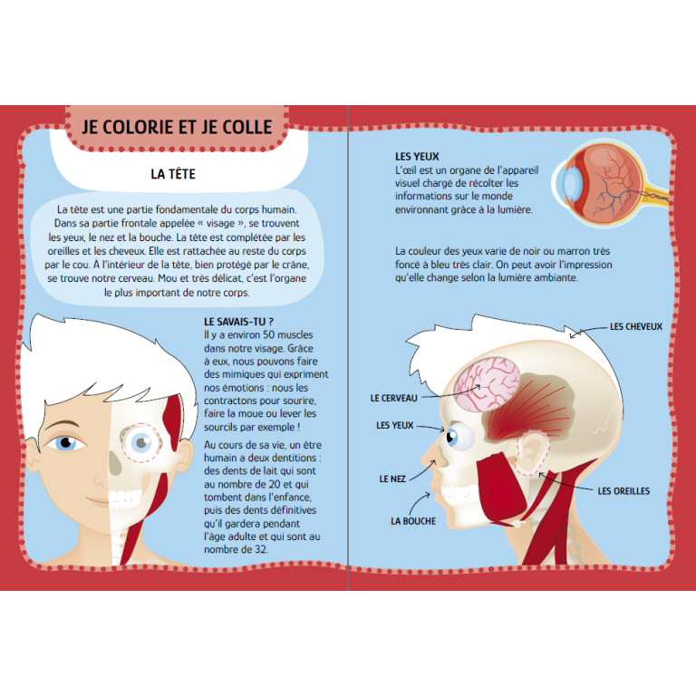 Explore le corps humain et apprends tout sur lui ! Découvre tout ce qu'il y a à savoir sur le squelette, les muscles, les systèmes circulatoire, respiratoire et digestif et le cerveau. Lis le livre de 32 pages, colorie les illustrations, colle les autocollants pour compléter les images, réalise les expériences proposées et enfin décore les planches avec les décalcomanies à sec.
