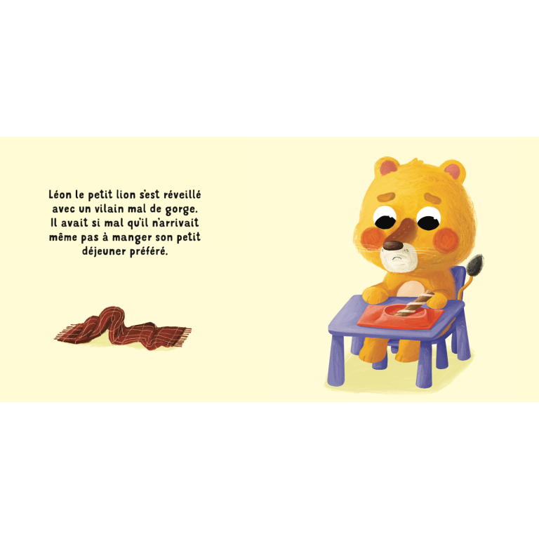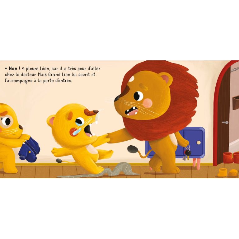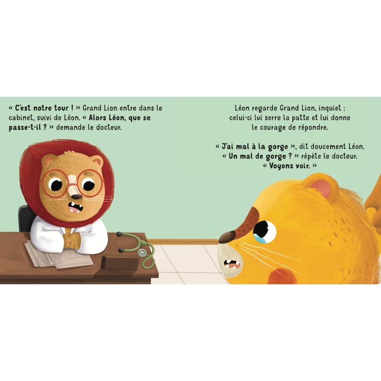 Léon se réveille avec un fort mal de gorge. Grand Lion décide donc de l’emmener chez le docteur. Mais Léon ne veut pas, car il a trop peur. Heureusement, grâce aux mots doux de Grand Lion et à la délicatesse du docteur, sa peur disparaît peu à peu et il comprend qu’aller chez le docteur, c’est pour se sentir mieux.