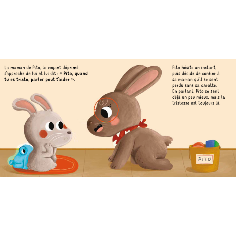 Pito est un petit lièvre qui vit dans une grande forêt. La plupart du temps, il est très joyeux, mais il arrive parfois que la tristesse envahisse son petit coeur. Cette tendre histoire apprend aux enfants à comprendre et à accepter la tristesse comme faisant partie de la vie. Ils pourront ainsi mieux affronter les moments difficiles.