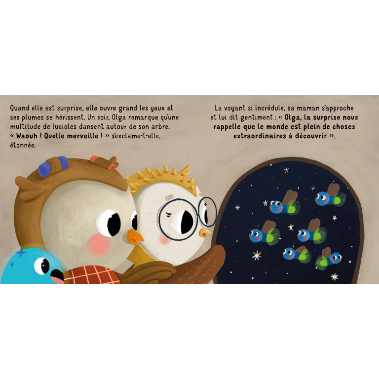 Olga est une chouette qui aime la tranquillité de son vieux tronc d’arbre. Mais un soir, un événement inattendu illumine la forêt : un ballet de lucioles transforme sa nuit en une aventure pleine d’émerveillement. Avec ses amis, Olga découvre que les surprises peuvent être le point de départ de découvertes étonnantes et de nouveaux liens d’amitié.
