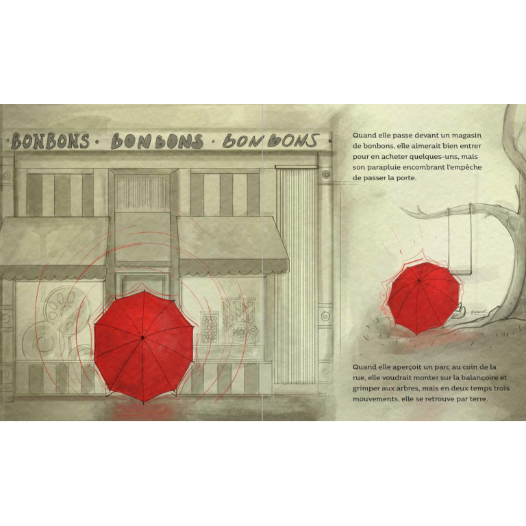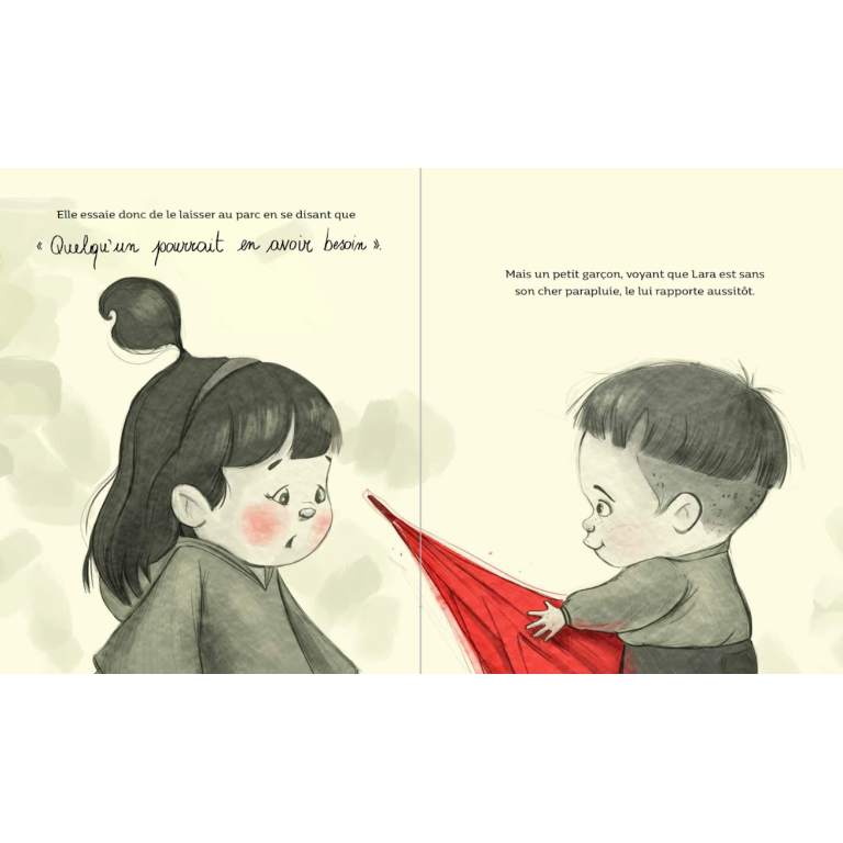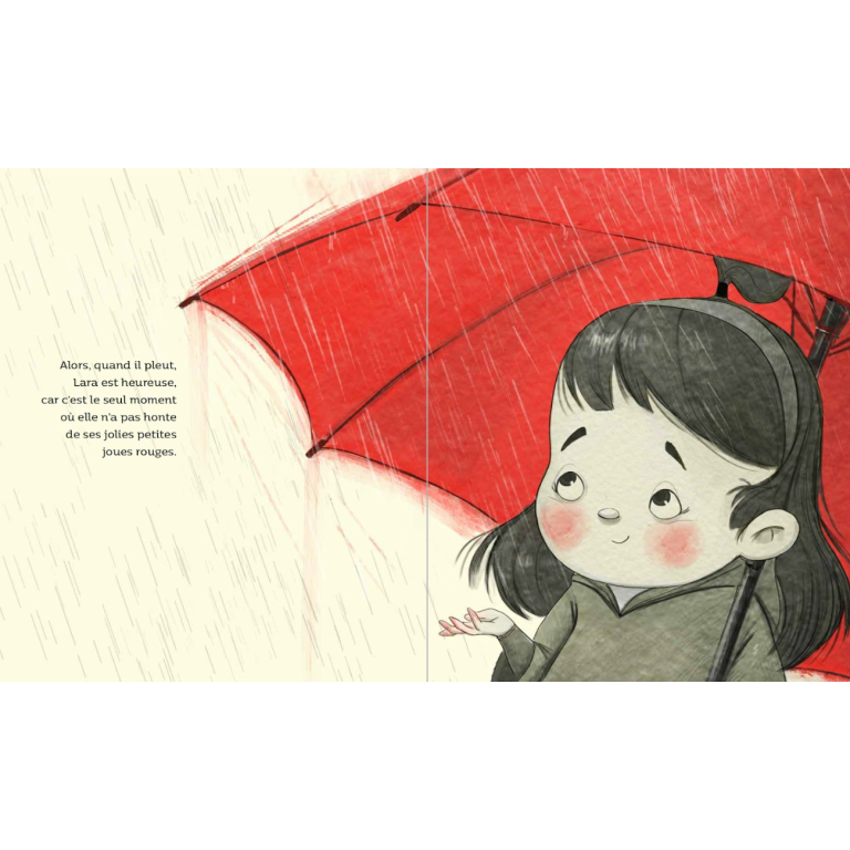 Lara est très timide, si timide que pour sortir de chez elle, elle se cache sous un grand parapluie rouge dont elle ne se sépare jamais. Mais Lara en a vraiment assez de ne pas pouvoir jouer librement ! Alors, un jour, elle décide de se débarrasser de son parapluie...