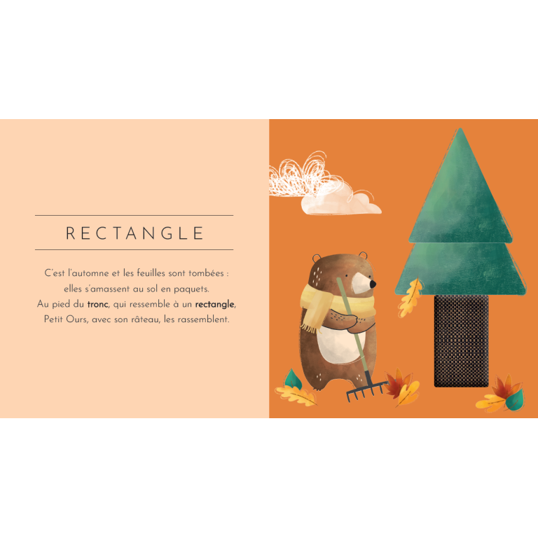 Cercle, carré, rectangle... découvrez les formes avec ce livre ! Suis les aventures du petit ours protagoniste au fil des pages : chaque page contient un insert fait d'un matériau différent pour découvrir le monde par le toucher.