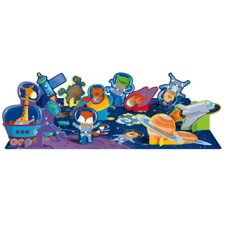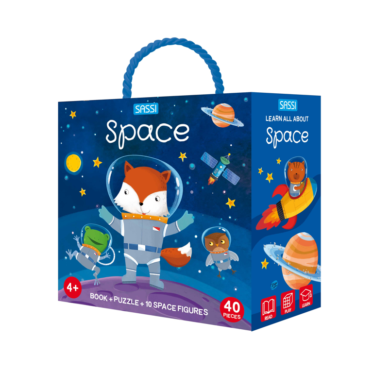 A box embellished with iridescent details that contains a 10-page book, a 40-piece puzzle, and 10 space figures to assemble and place on the puzzle, to learn how to recognize colors, shapes, numbers, and associate words.