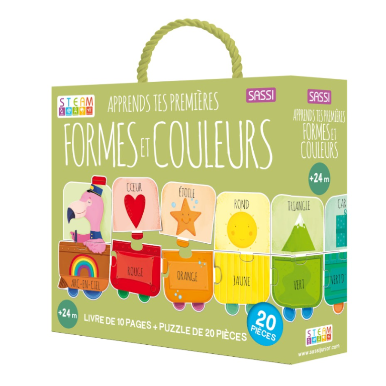 Un livre de 10 pages et un puzzle de 20 pièces géantes pour créer un petit train et apprendre les premières formes et les couleurs.