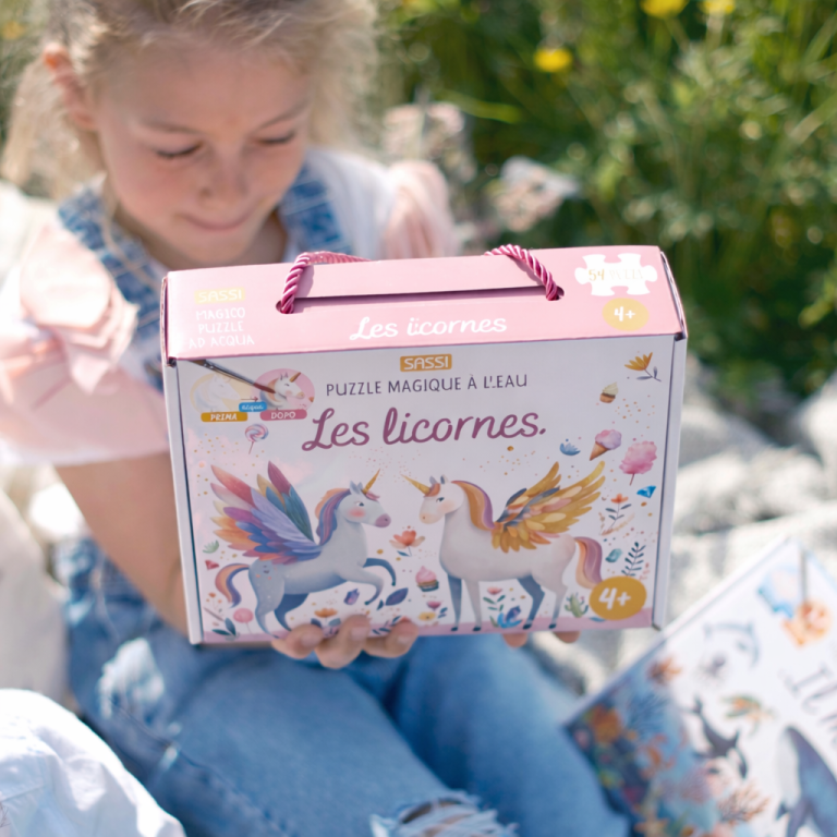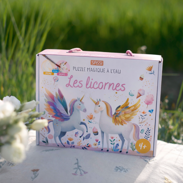 Une boîte contenant un puzzle de 54 pièces à colorier à l’eau et un petit livre de 16 pages. Mouille le puzzle avec le pinceau pour faire apparaître les dessins : tu peux le colorier autant de fois que tu le souhaites !