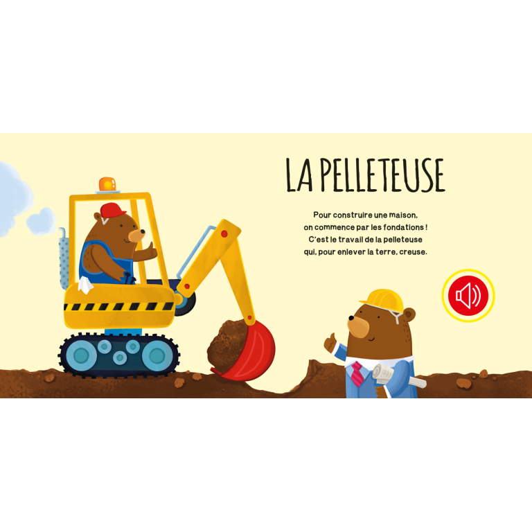 Lis les aventures des adorables animaux au travail sur le chantier, appuie sur les boutons sonores et apprends à reconnaître les bruits des véhicules. Fais monter et descendre la poignée : tu entendras le vacarme d’un véritable chantier qui t’accompagnera pendant la lecture !
