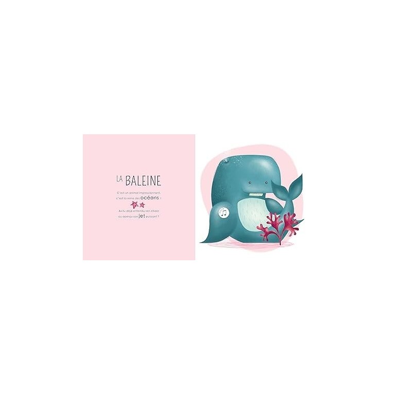 De nombreux animaux vivent parmi les flots : découvre qui ils sont en feuilletant les pages de ce livre et appuie sur les boutons pour découvrir les bruits de la mer !