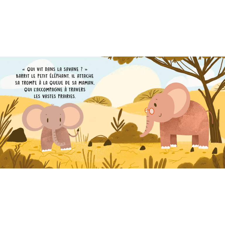 Quels sont les animaux qui vivent dans la savane ? Découvre, avec le petit éléphant, quelques-unes des créatures qui vivent dans cet habitat en écoutant les sons qu’elles émettent.