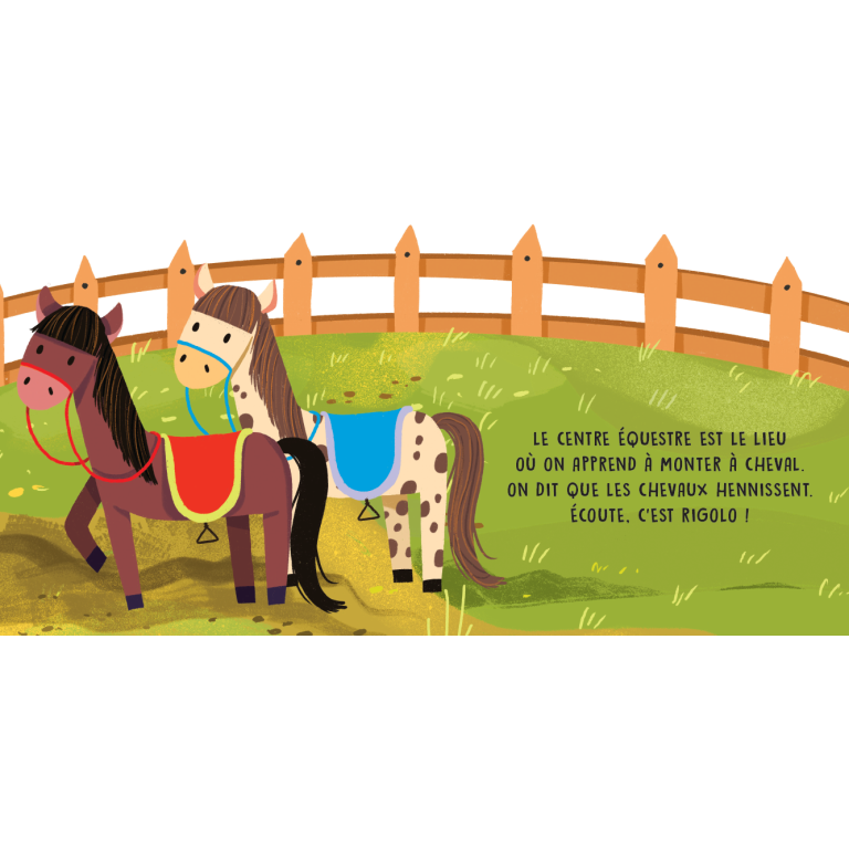 Un livre sonore avec des illustrations simples et délicates et six sons délicieux, pour apprendre à reconnaître les sons produits à l’intérieur d’un centre équestre.