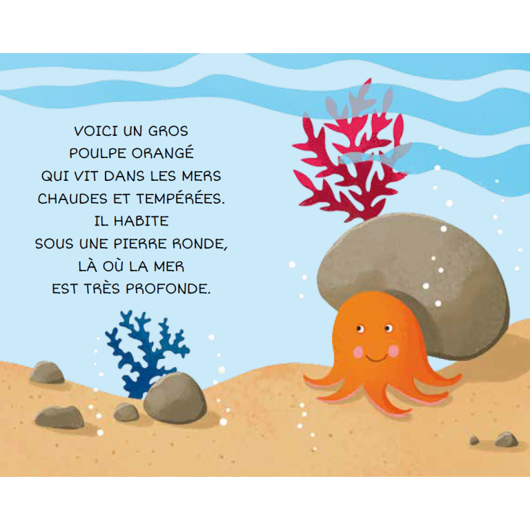 Huit petits livres solides t’apprendront à reconnaître les habitants de la mer et leurs habitudes. Découvre la baleine, le requin, l’étoile de mer, la méduse, l’hippocampe, le crabe, la pieuvre et les poissons tropicaux !