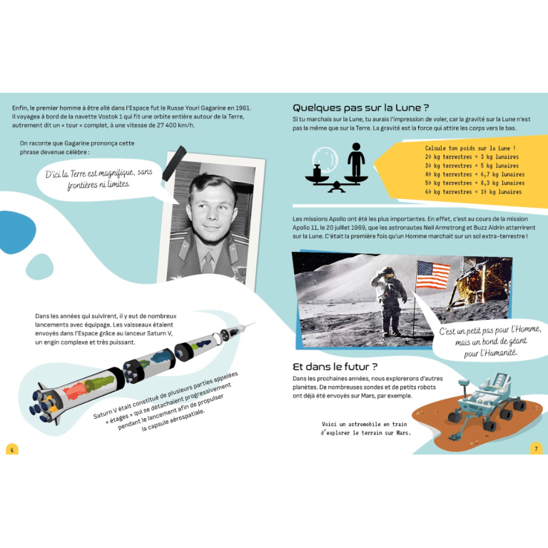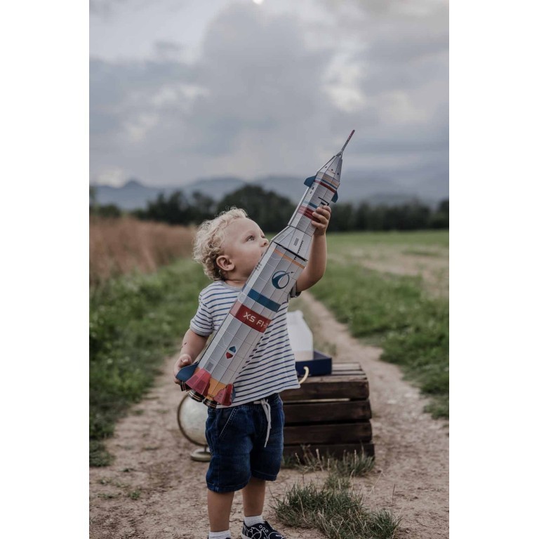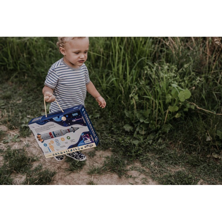 Une boîte qui contient un livre de 32 pages consacré à l’espace et à son exploration, et les pièces pour construire une maquette de fusée spatiale.