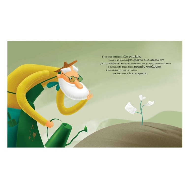 In una fiabesca terra senza nome, un vecchio omino scrive a macchina su di un foglio bianco che, annaffiato e coltivato amorevolmente, dà vita a uno, due, cento, mille volumi popolati da storie e creature fantastiche, capaci di raggiungere ogni lettore in grado di coglierne la magia. Il libro si presenta come una poetica dedica illustrata alle prime pagine della vita di ciascun amante dei libri e alle tante avventure scritte per aprire le porte della fantasia.