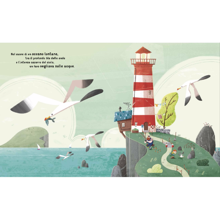 Nel cuore di un oceano lontano, tra il profondo blu delle onde e l’intenso azzurro del cielo, un faro vegliava sulle acque. Nel cuore del faro vivevano un papà e la sua bambina, felici di un amore raro, tipico del cuore caldo di chi è abituato a custodire.