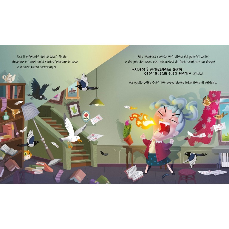 Ogni mattina, alla finestra, il gatto ammirava i fantastici voli del corvo. Guardandolo volare nelle sue eleganti penne nere, fantasticava di essere libero. Perché lui, purtroppo, non poteva mai uscire da quelle quattro mura. La padrona di casa era una maestra, simpatica come una pianta carnivora velenosa. Passava tutto il tempo a correggere i compiti con la penna rossa, e non voleva assolutamente essere disturbata, da nessuno. Riuscirà il corvo a ingegnare un piano per liberare il gatto, stanco di essere sempre rinchiuso?