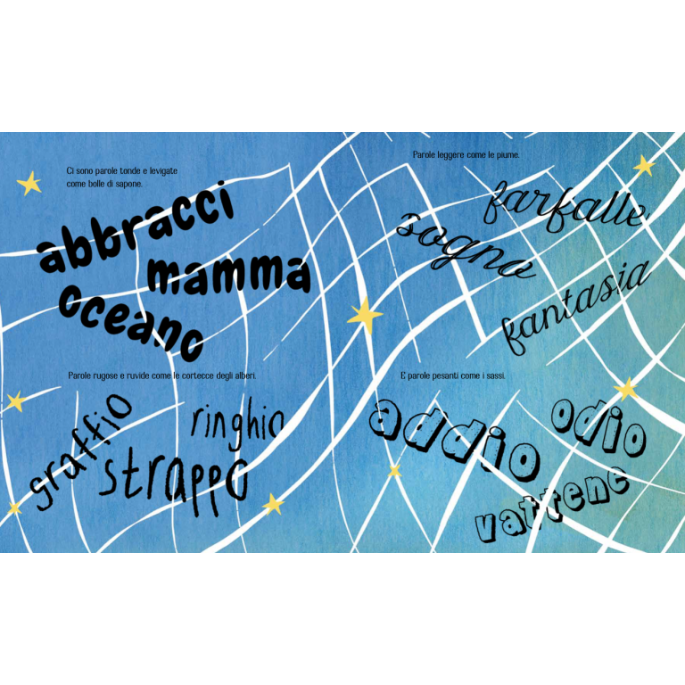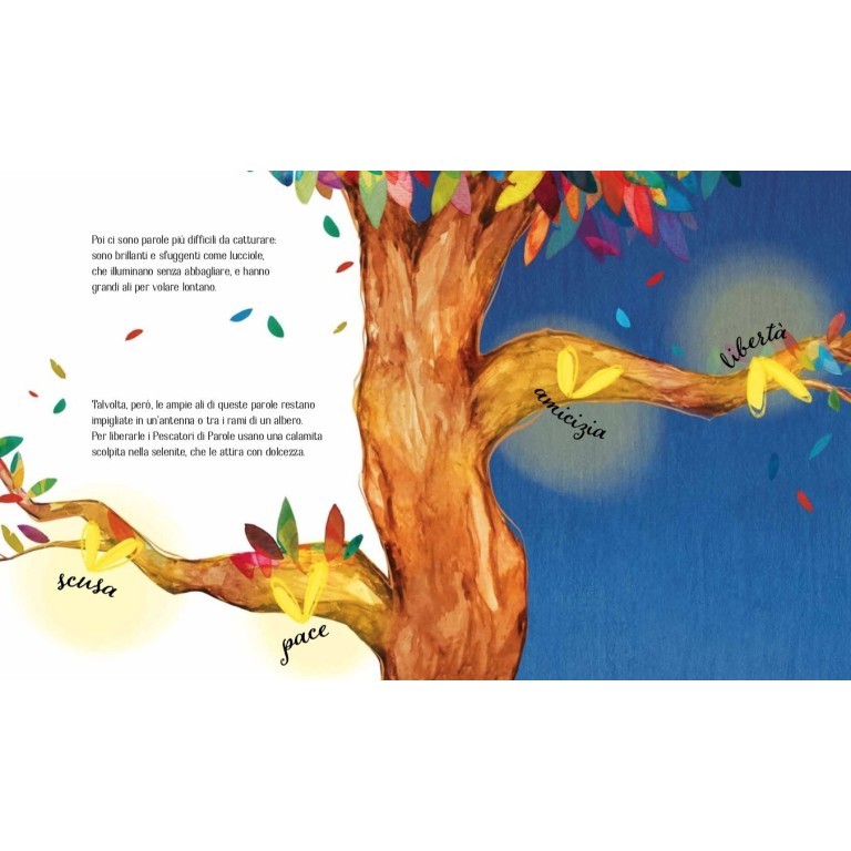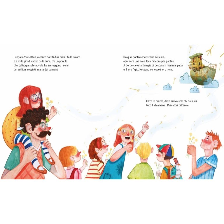 C'è una nave che ogni notte solca i cieli di tutto il mondo per raccogliere le parole che sono rimaste sospese a mezz'aria. A bordo c'è una famiglia di pescatori. Nessuno conosce i loro nomi. Oltre le nuvole, dove solo chi ha le ali può arrivare, tutti li chiamano i pescatori di parole. Con reti intessute di stelle raccolgono parole di ogni specie e dimensione, ma ce n'è una, grande e brillante, che proprio non riescono ad afferrare, eppure è così bella e luminosa che non possono arrendersi.
