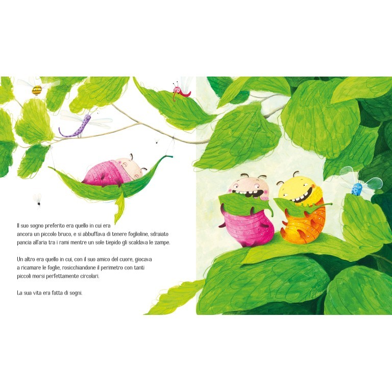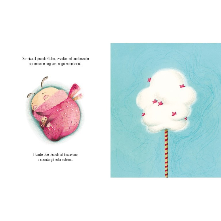 Gelso è un piccolo baco avvolto in un bozzolo spumoso, che sogna sogni zuccherini appeso a un ramo di gelso. Un mattino, però, un temporale lo strappa dall’albero, soffiandolo via lontano. A trovarlo è un bambino, che lo riporta al suo ramo e se ne prende cura finché, un giorno, dal bozzolo spunta una farfalla. I due, finalmente, possono guardarsi negli occhi: uno sguardo che racchiude tutta la meraviglia della loro insolita amicizia.