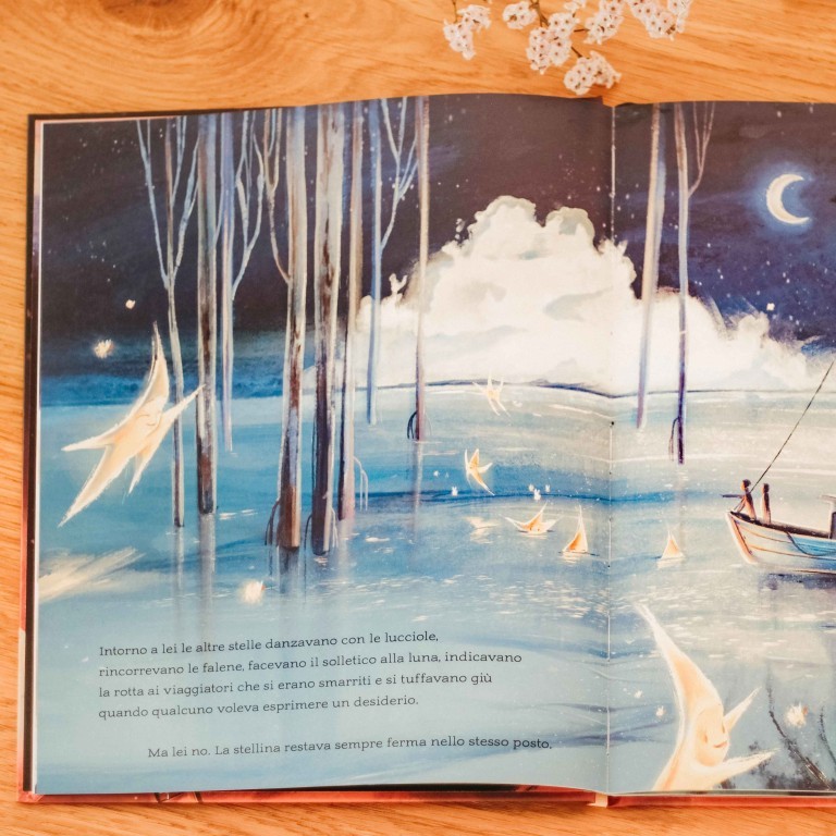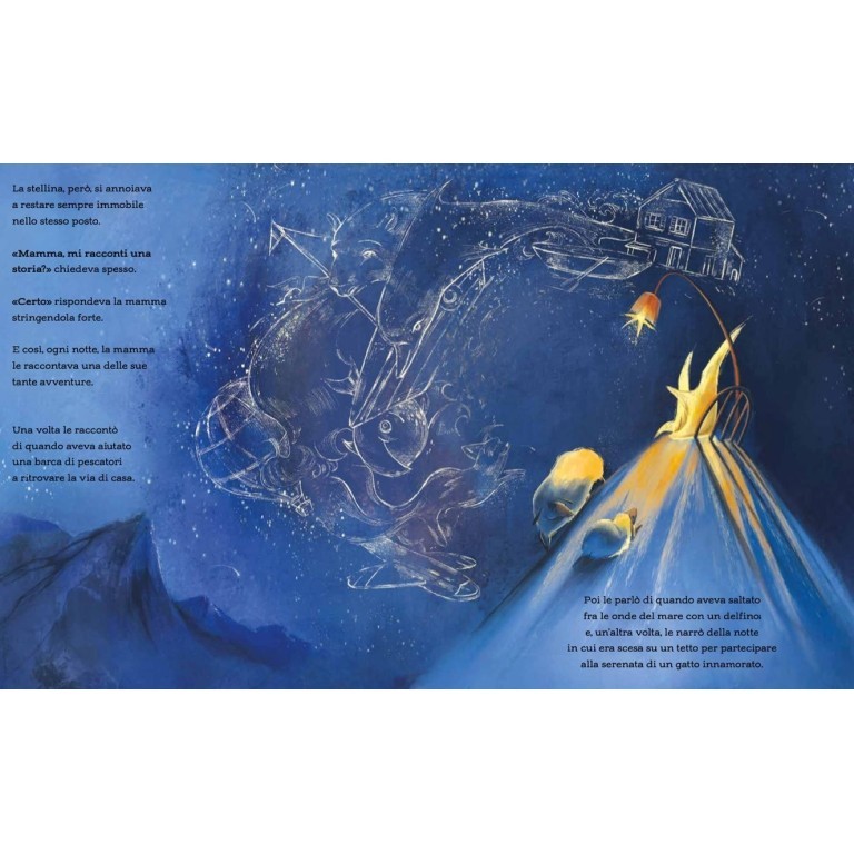 In un angolo del cielo attraversato dalla Via Lattea brillava una stellina. Ogni notte si svegliava e iniziava a diffondere il suo bagliore. Solo pochi, però, potevano vederlo, perché la stellina non si spostava mai dal suo cantuccio accanto alla sua mamma. Intorno a lei le altre stelle danzavano con le lucciole, rincorrevano le falene, facevano il solletico alla luna, indicavano la rotta ai viaggiatori che si erano smarriti e si tuffavano giù quando qualcuno voleva esprimere un desiderio. Ma lei no. La stellina restava sempre ferma nello stesso posto.
