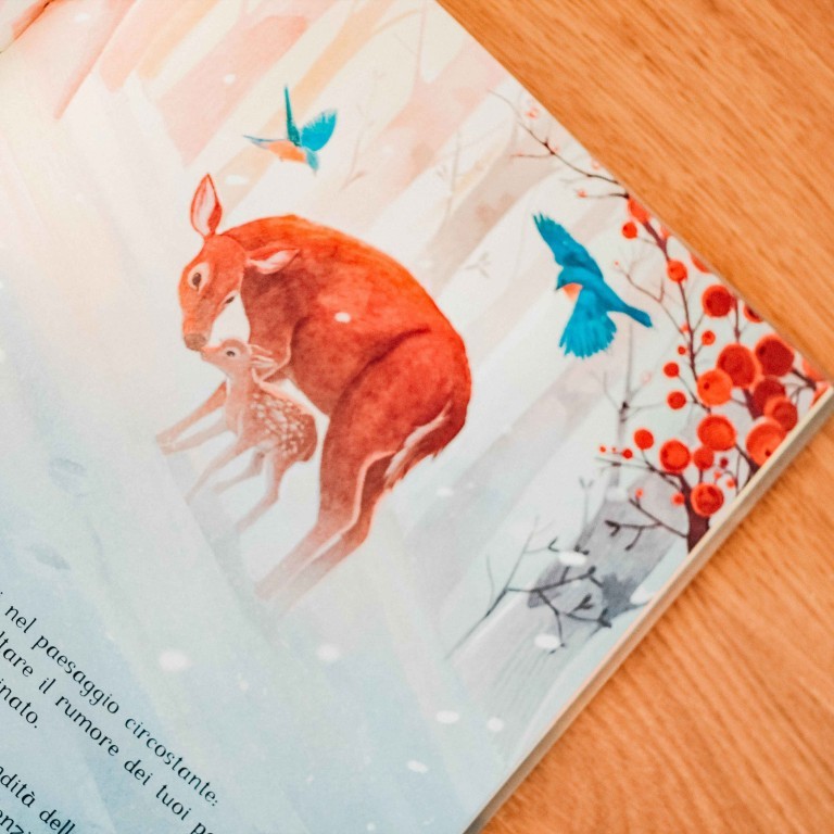L'inverno è bianco e delicato, avvolto nella sua silenziosa lentezza. Se ti senti freddo come una lepre solitaria, stanco come un tasso addormentato, smarrito come un piccolo cerbiatto, accogli la stagione dentro di te: abbraccia le emozioni positive e negative, e danza leggero tra i fiocchi di neve.