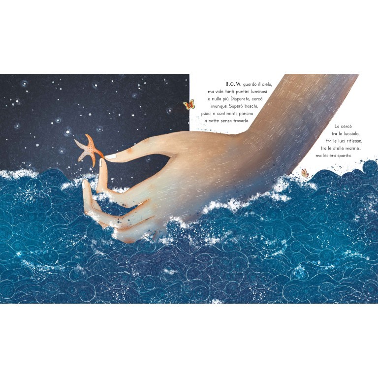 B.O.M. era un gigante e, prima di quella notte, non credeva che avrebbe trovato qualcosa più grande di lui. Invece, l’amore per quella stella superò ogni cosa. Così, per stare più tempo con lei, ogni mattina correva verso ovest per raggiungere il primo posto su cui calava la notte. Ma un giorno la stella cadde dal cielo...