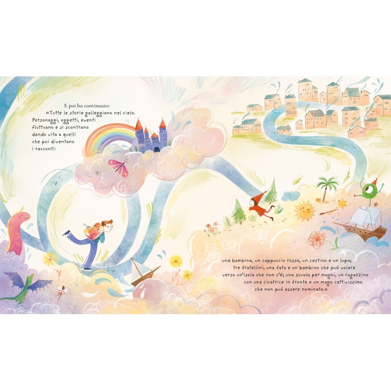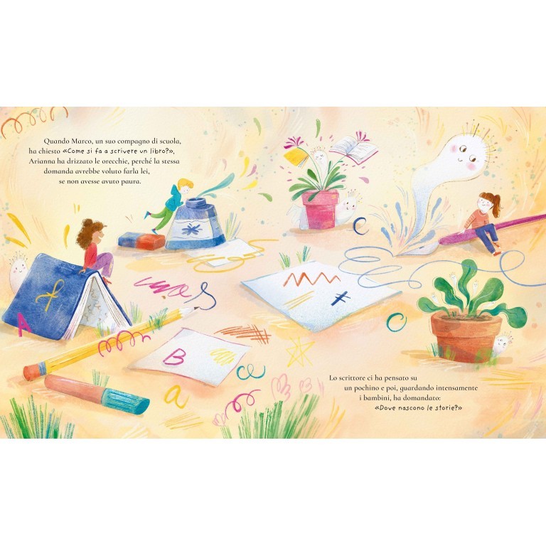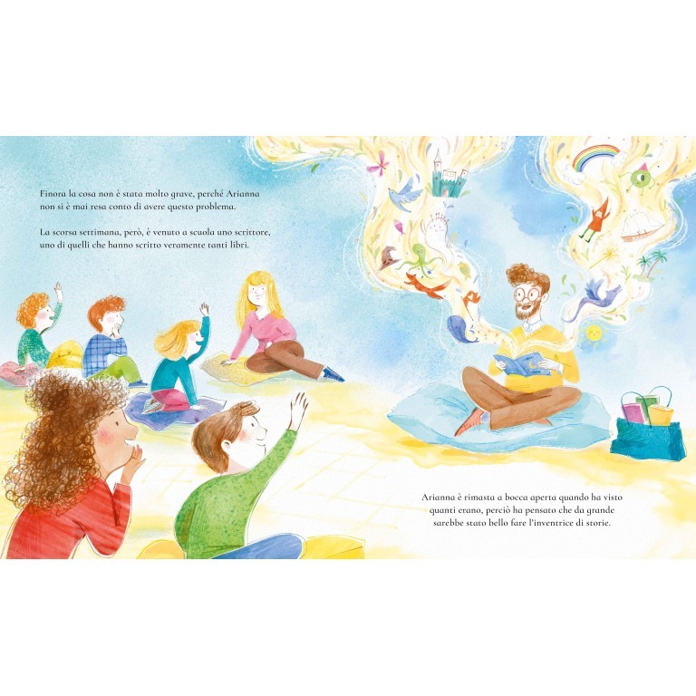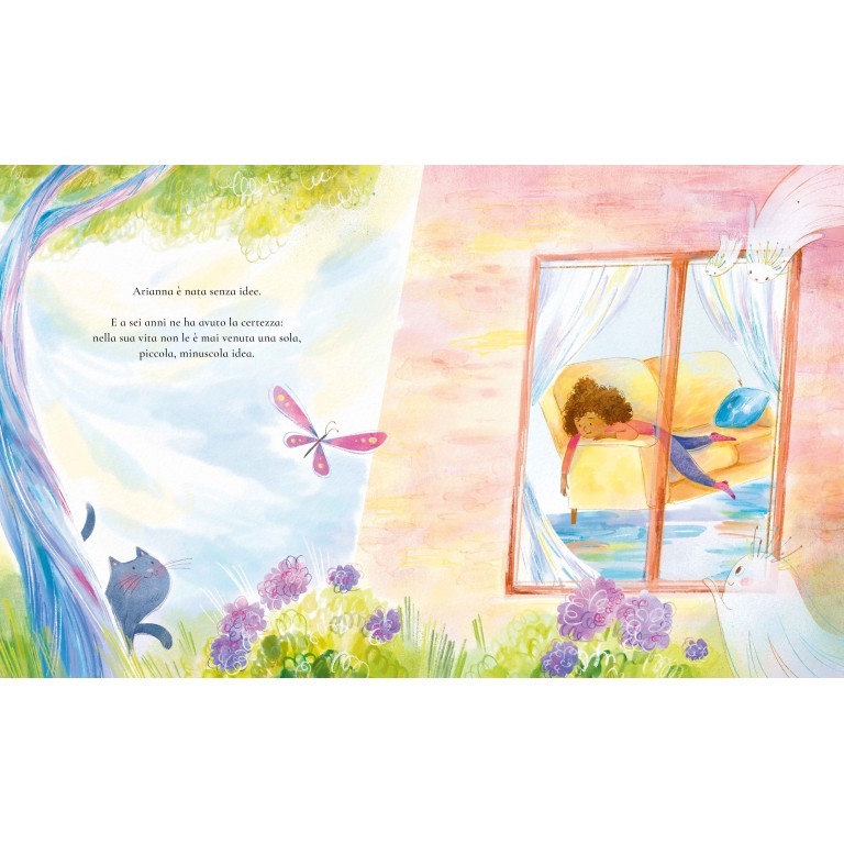 Arianna crede di non avere alcuna idea. Un incontro speciale con un grande scrittore, però, la porta a scoprire un mondo nascosto, dove le storie galleggiano nel cielo e aspettano solo di essere catturate. Con l’aiuto di un retino per farfalle, Arianna impara a “catturare” idee e a inventare storie straordinarie, dando vita a personaggi e avventure fantastiche.