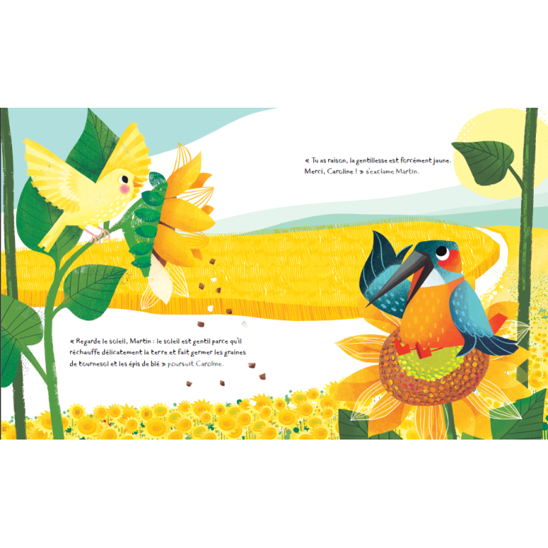 Martino, un martin-pêcheur, aimerait savoir de quelle couleur est la gentillesse. Il vole partout en posant à tous ceux qu’il croise la même question : « De quelle couleur est la gentillesse ? » Les réponses sont toujours différentes, mais grâce à cela, Martino comprend que la gentillesse peut avoir toutes les nuances de l’arc-en-ciel.