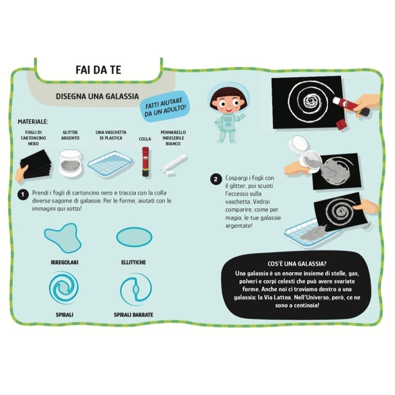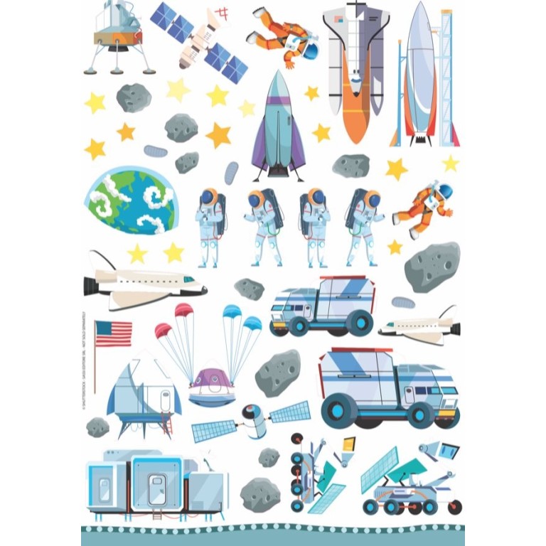 Un kit formato da stickers, trasferibili e da un libro di 32 pagine per scoprire tutti i segreti dello Spazio in modo ludico e divertente!