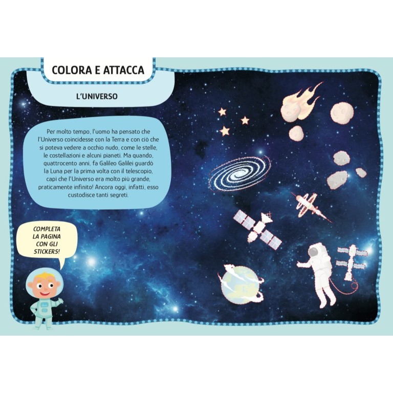 Pianeti, stelle, asteroidi, e molto altro: scopri tutti i segreti dei corpi celesti attraverso tantissime attività! Leggi il libretto di 32 pagine, colora le illustrazioni, attacca gli stickers per completare le immagini, realizza gli esperimenti proposti e infine decora le tavole con i trasferibili.