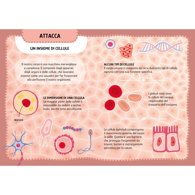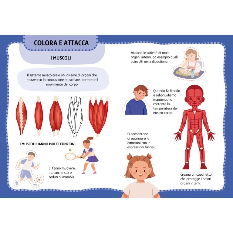Esplora il corpo umano e impara tante nozioni! Scopri tutto quello che c'è da sapere sullo scheletro, i muscoli, i sistemi circolatorio, respiratorio e digestivo, e il cervello. Leggi il libretto di 32 pagine, colora le illustrazioni, attacca gli adesivi per completare le immagini, eseguite gli esperimenti proposti e infine decora le tavole con i trasferibili.