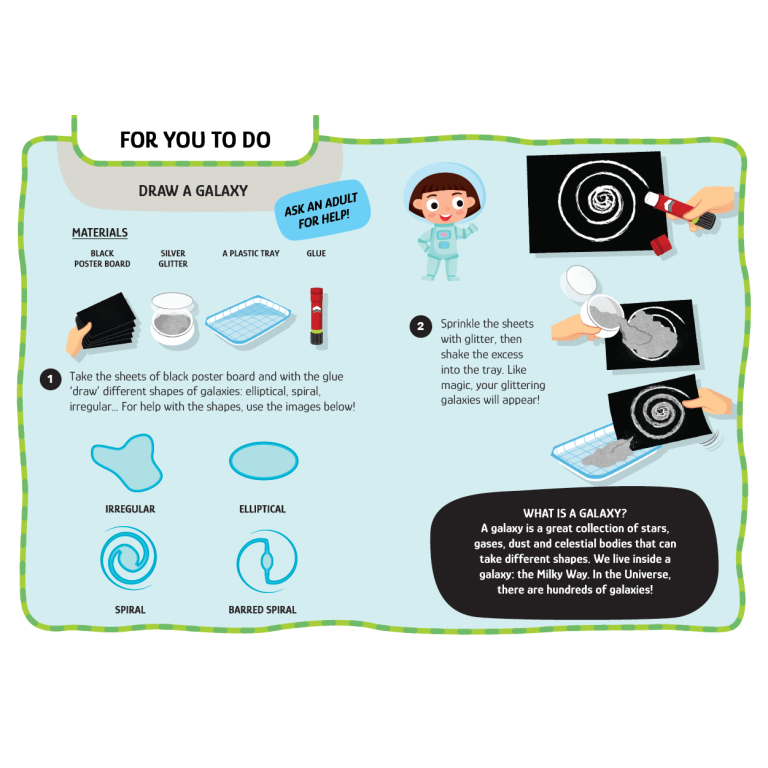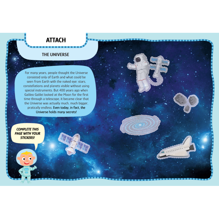 A kit featuring stickers, transfers, and a 32-page book to discover all the secrets of Space in a fun and playful way! It contains: 200 transfers, 50 stickers. Planets, stars, asteroids, and much more: discover all the secrets of celestial bodies through tons of activities!
