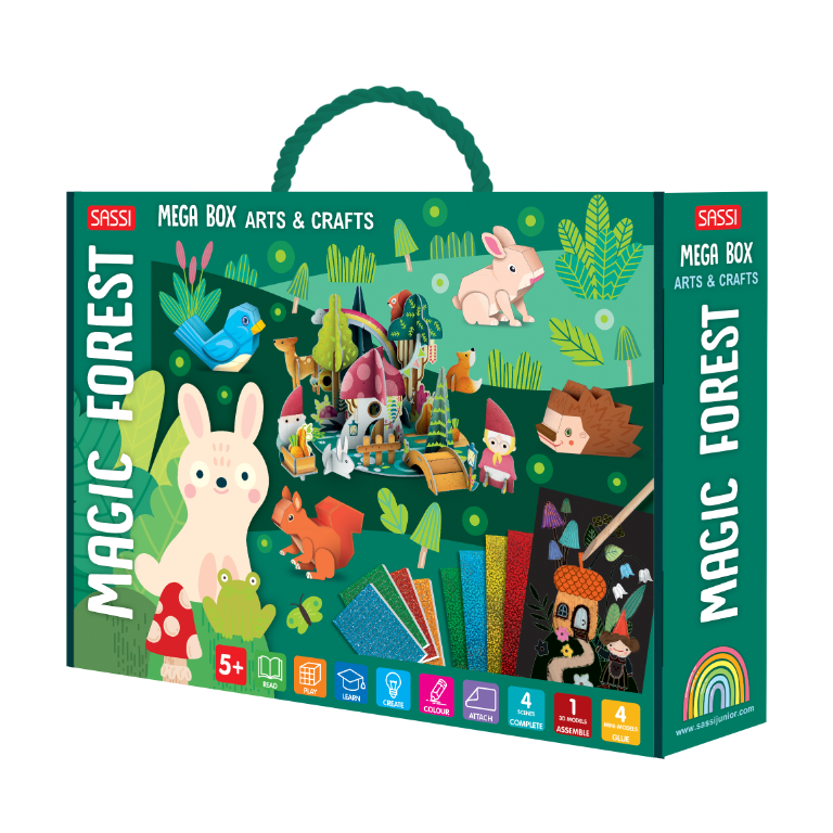 This mega box is packed with creative fun! It contains a 32-page activity book, 3 dinosaur models to assemble, 2 scenarios to complete with stickers, 2 sheets of mini origami to build, 4 scratching sheets with a wooden stick, and 2 scenarios to complete with iridescent sheets, glitter, and colored tiles