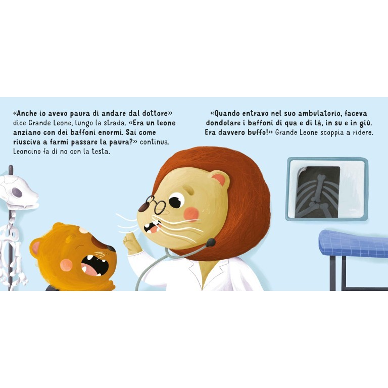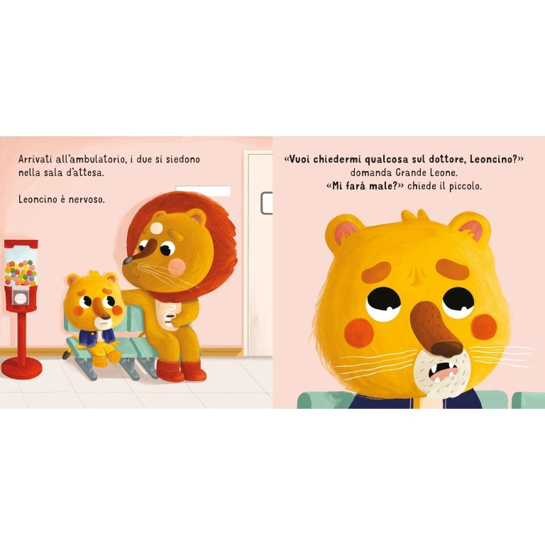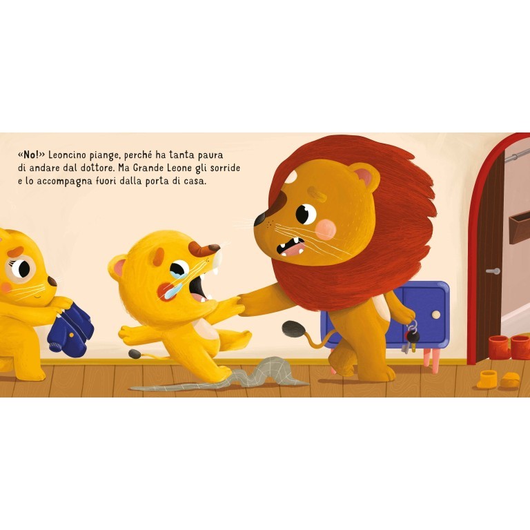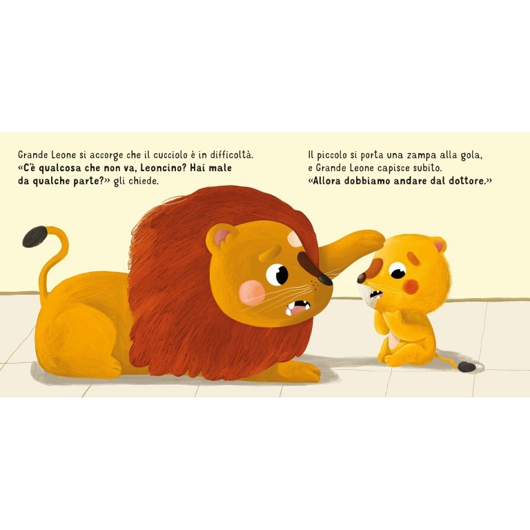 Tutti i bambini, prima o poi, devono andare dal pediatra, ma non è sempre facile: molti, infatti, nel momento in cui si trovano di fronte a una persona sconosciuta, in un ambiente poco noto, in mezzo a odori e strumenti che non conoscono, hanno molta paura. È quello che accade anche a Leoncino, quando deve andare dal dottore per curare un forte mal di gola. Grazie alla calma di Grande Leone, alle sue spiegazioni e all’approccio gentile del dottore, il cucciolo riuscirà a superare la paura dell’ambulatorio medico.