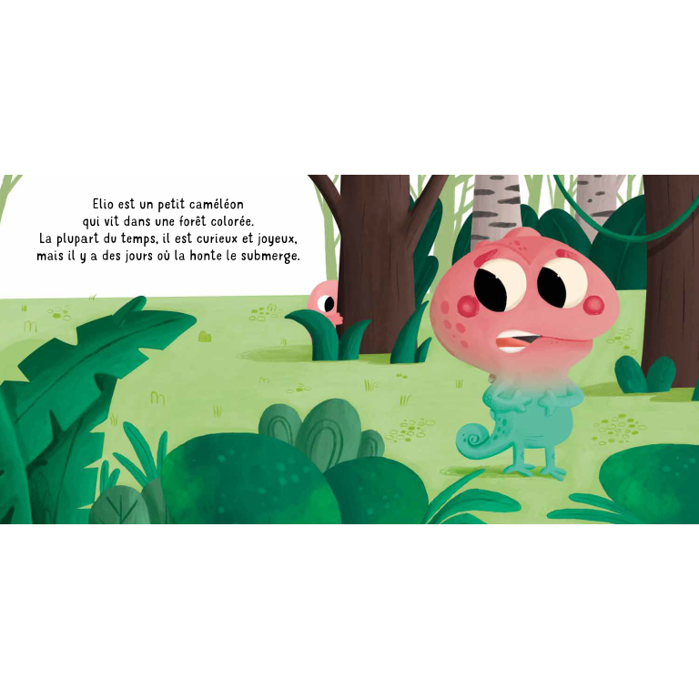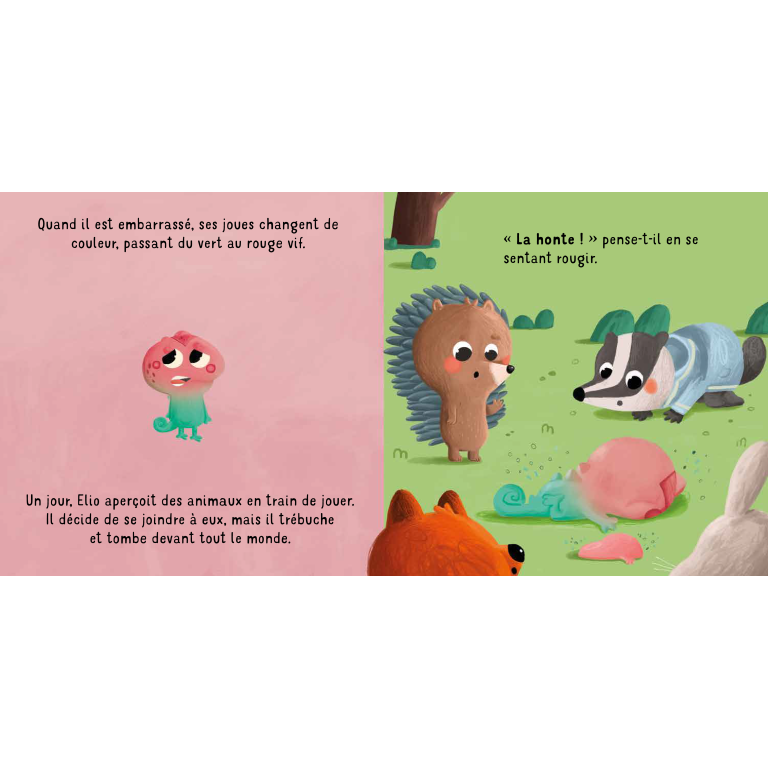 Elio est un petit caméléon qui vit dans une forêt pleine de couleurs. Un jour, alors qu’il joue avec ses amis, il trébuche et tombe devant tout le monde. Il se sent submergé par la honte et voudrait disparaître. Grâce à la bienveillance de ses amis, Élio comprend que tout le monde peut vivre des moments embarrassants, et que les partager permet de se sentir compris et soutenu.