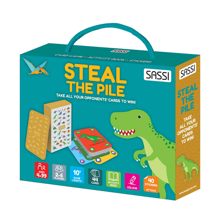 The popular game of "Steal the Pile" presented in a reinterpretation designed for the little ones: 44 dinosaur-themed cards, accompanied by a 16-page book full of games and activities, and 40 stickers, to have fun together with the whole family!