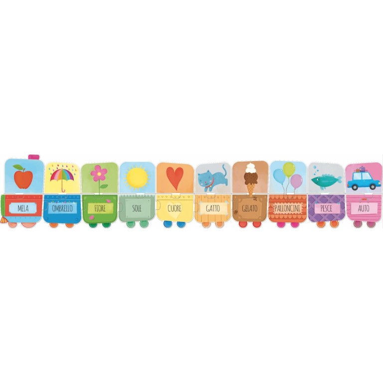 Un libro di 10 pagine e un puzzle di 20 pezzi giganti per creare un trenino e imparare le prime parole.