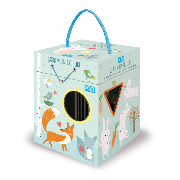 The sun shines in the sky and a new day has begun: read the illustrated booklet and discover what actions the little forest animals do after waking up! Learn to recognize the shapes of the circle, square, triangle, and rectangle, and guess their place inside the 'good morning' cube: have fun fitting them in and completing each scene!