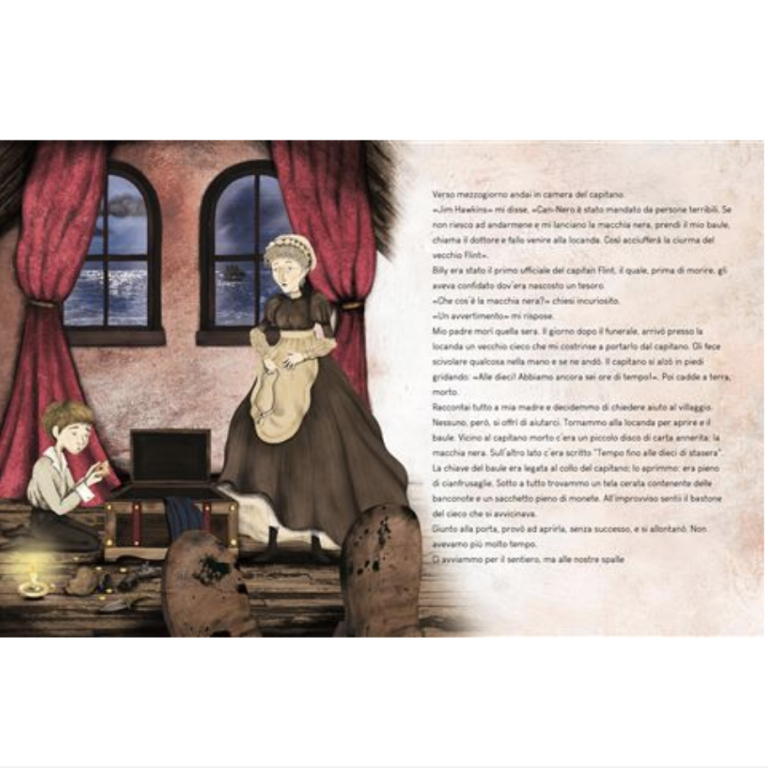 Jim Hawkins, le protagoniste et narrateur de l'histoire, trouve une vieille carte dans le coffre du pirate Billy Bones, un pensionnaire de l'auberge familiale. C'est la carte d'une île, l'île au trésor pour être précis. Une narration à suspense, entre réalité et fiction, pour découvrir le monde fascinant des pirates. Une adaptation du célèbre roman de Robert Louis Stevenson, un classique mondial de la littérature jeunesse, mise en valeur par des éléments aux reflets irisés sur la couverture.