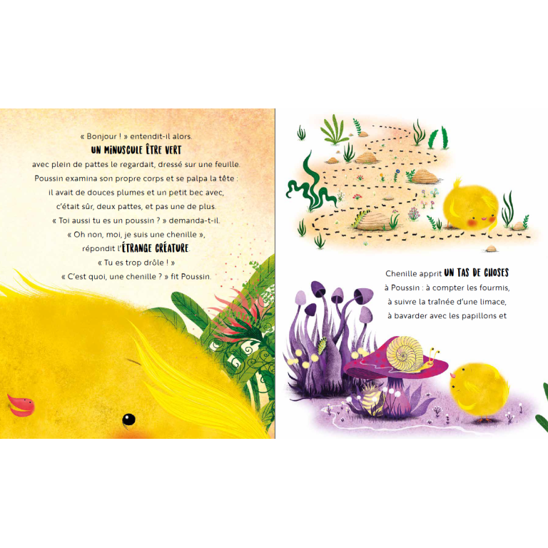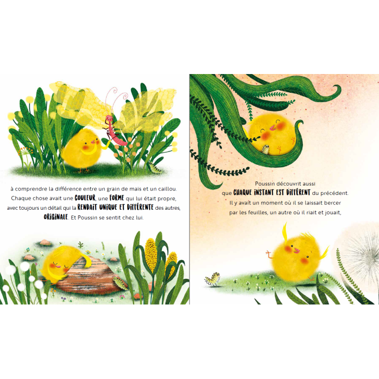 Petit poussin fait ses premiers pas dans le monde qui regorge de créatures et d’expériences à découvrir. Mais son enthousiasme pour la nouveauté s’amenuise face à la solitude… Finalement, petit Poussin comprend que le bonheur n’existe que s’il est partagé. Une adorable histoire qui fleure bon la famille et la joie d’être ensemble.