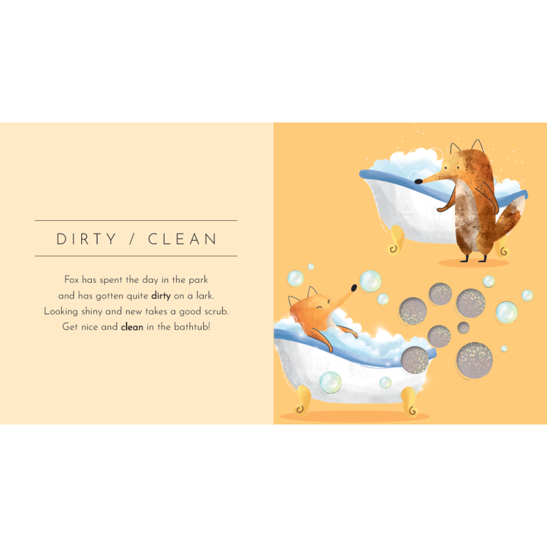 Big-small, dirty-clean, empty-full... discover all the concepts of opposites following the adventures of the little fox protagonist! Each page contains a surprise: an insert of different material to experience the world through touch.