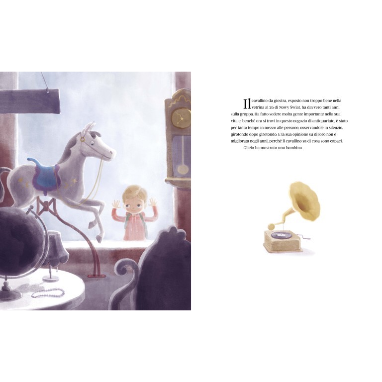 Il cavallino da giostra, esposto non troppo bene nella vetrina al 26 di Nowy Świat, ha davvero tanti anni sulla groppa. Ha fatto sedere molta gente importante nella sua vita e, benché ora si trovi in questo negozio di antiquariato, è stato per tanto tempo in mezzo alle persone, osservandole in silenzio, girotondo dopo girotondo. E la sua opinione su di loro non è migliorata negli anni, perché il cavallino sa di cosa sono capaci. Glielo ha mostrato una bambina.